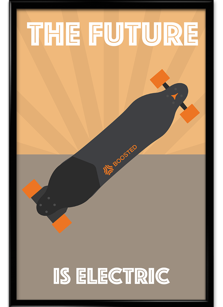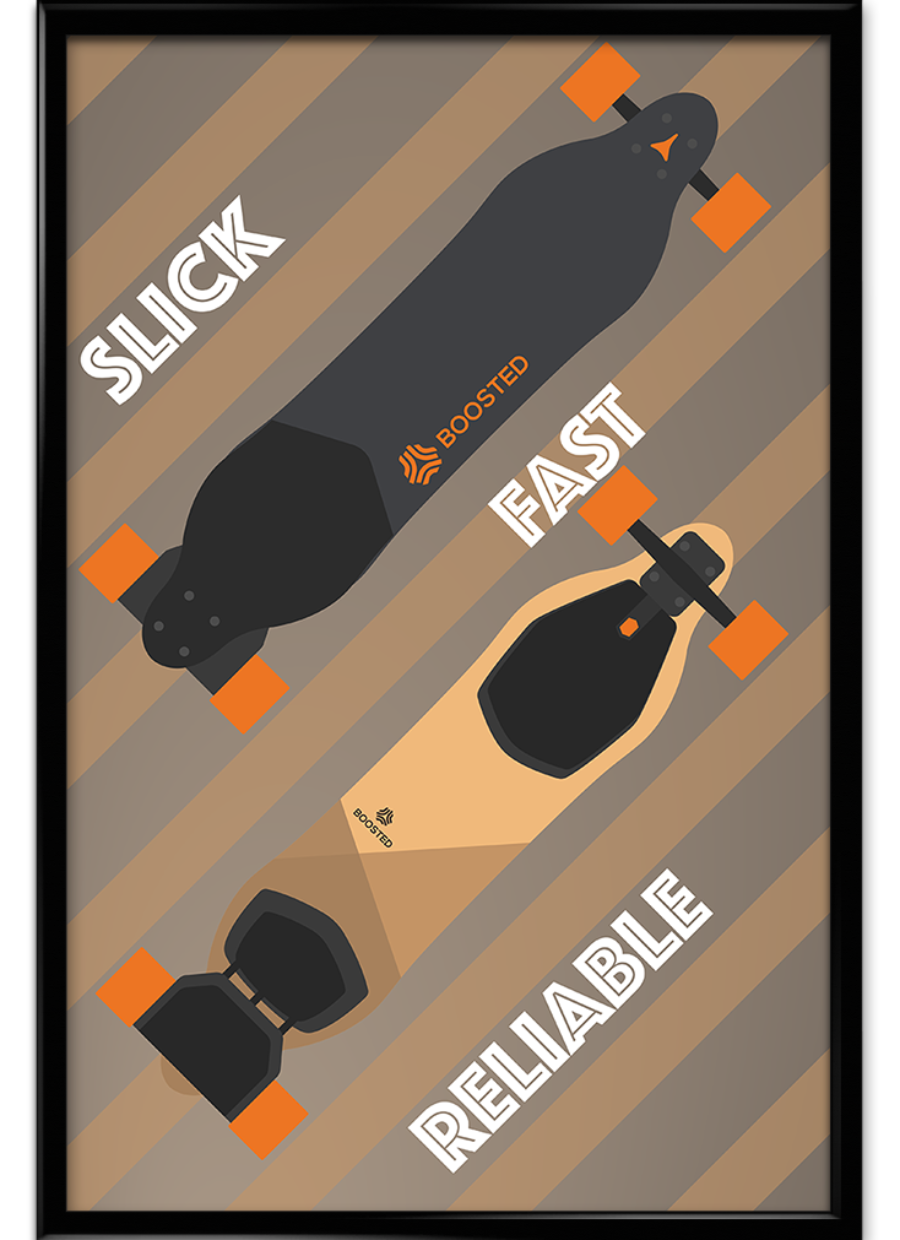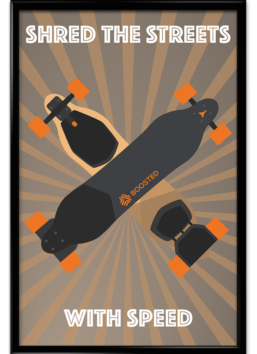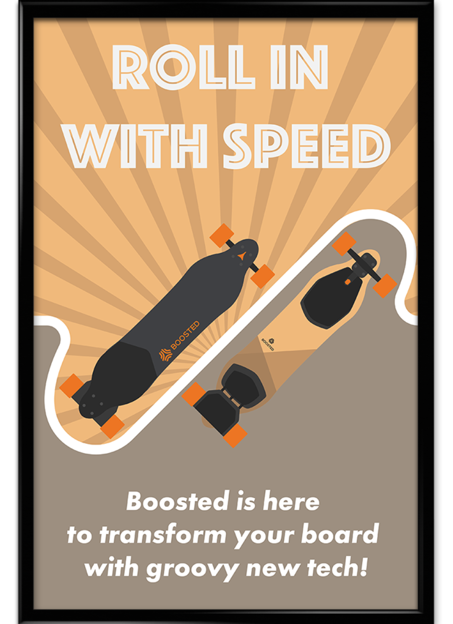 This campaign mockup advertises BoostedBoard in a minimalistic style. The taglines were made in a way to grab attention of the generation that used to skateboard in the past.