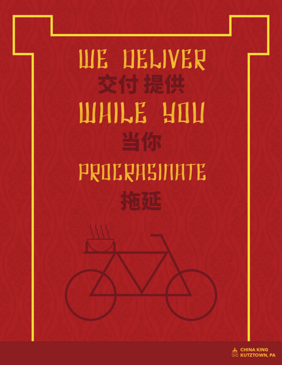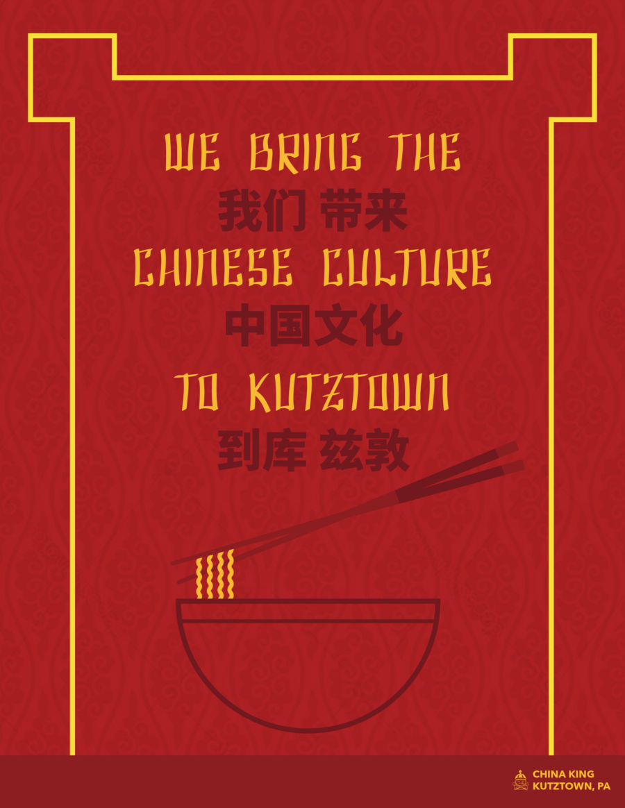 ChinaKing is an authentic family owned restaurant based in Kutztown, Pennsylvania. This campaign concept was designed to bring the chinese culture and minimalism together. It demonstrates that they deliver fresh food to the local area and to students at Kutztown University.